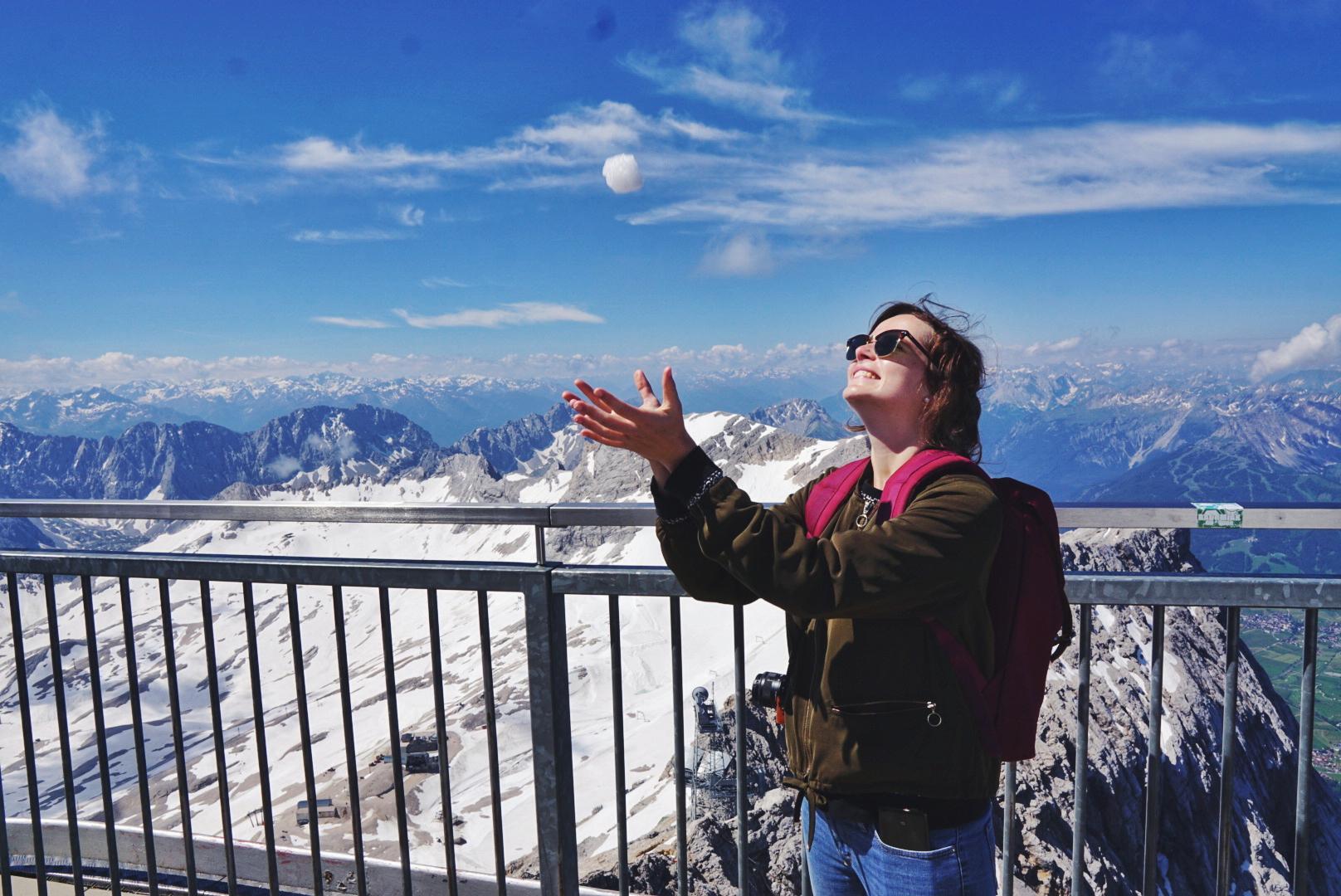 Wir kommen 9 Uhr auf dem Parkplatz der Zugspitze an: Fast niemand parkt hier! Für 8 Stunden zahlen wir 9 Euro. In die Seilbahn gehen gerade einmal 25 Leute rein, eigentlich wäre Platz für 120 Personen. Ich denke, dass wir ganz schön viel Glück hatten. Was eine Fahrt auf die Zugspitze kostet? Im Sommer kostet eine Berg- und eine Talfahrt (mit der Zahnradbahn und/oder der Seilbahn Zugspitze) inkl. unbegrenzten Fahren mit der Gletscherbahn, die Dich zum Schlittenfahren-Gipfel bringt, 61 € pro Erwachsener. Teuer, aber absolut lohnenswert, wie ich finde.